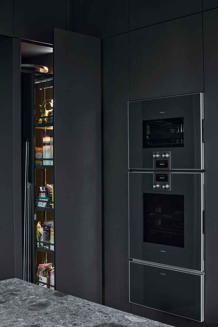 Bora, Weinkühlschrank, Quooker, Geschirrspüler Miele, GAGGENAU Dampfbackofen Anthrazit, Pyrolyse-Backofen anthrazit und Wärmeschublade, LIEBHERR Einbaukühl-Gefrier-Kombi und Einbaukühlschrank, Miele ProfiLine, Spülbecken KeraDomo Mera 80 U/g Lava von systemceram, Unterbauspüle in Keramic Farbton Lava, Ablaufgarnitur mit Handbetätigung