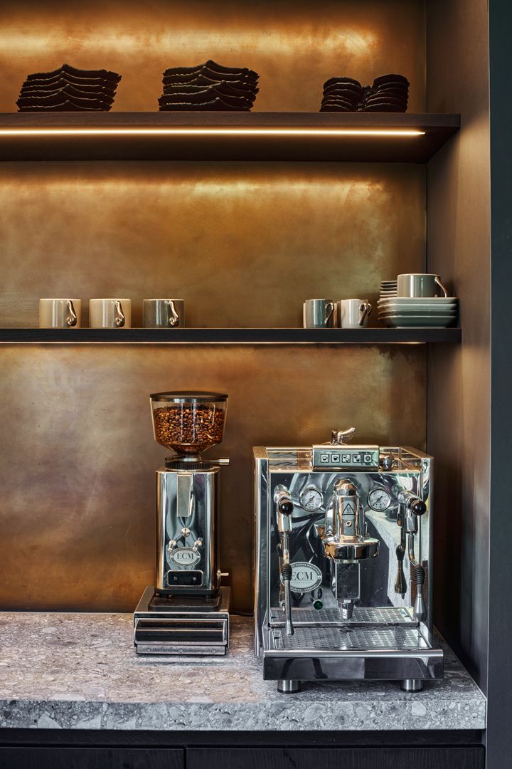 in Messingfarben, 2 feste Böden jeweils mit LED-Beleuchtung, Muschelgriffe, grifflos bzw. Push to Open