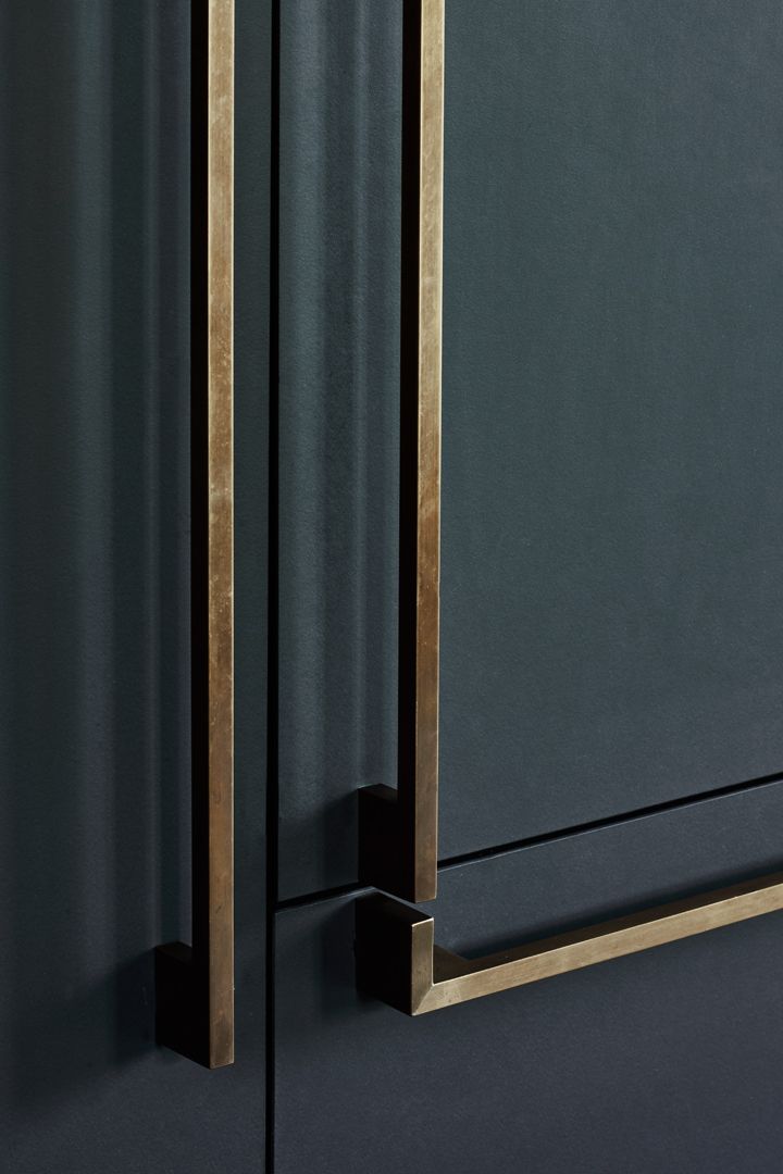mit Aufkantung im Front- und Sichtbereich, Front Träger FPY 15 mm mit beidseitig Desktop Linoleum 4166 Charcoal, Korpus innen Dekorplatte Anthrazit; Stangengriff Messing brüniert